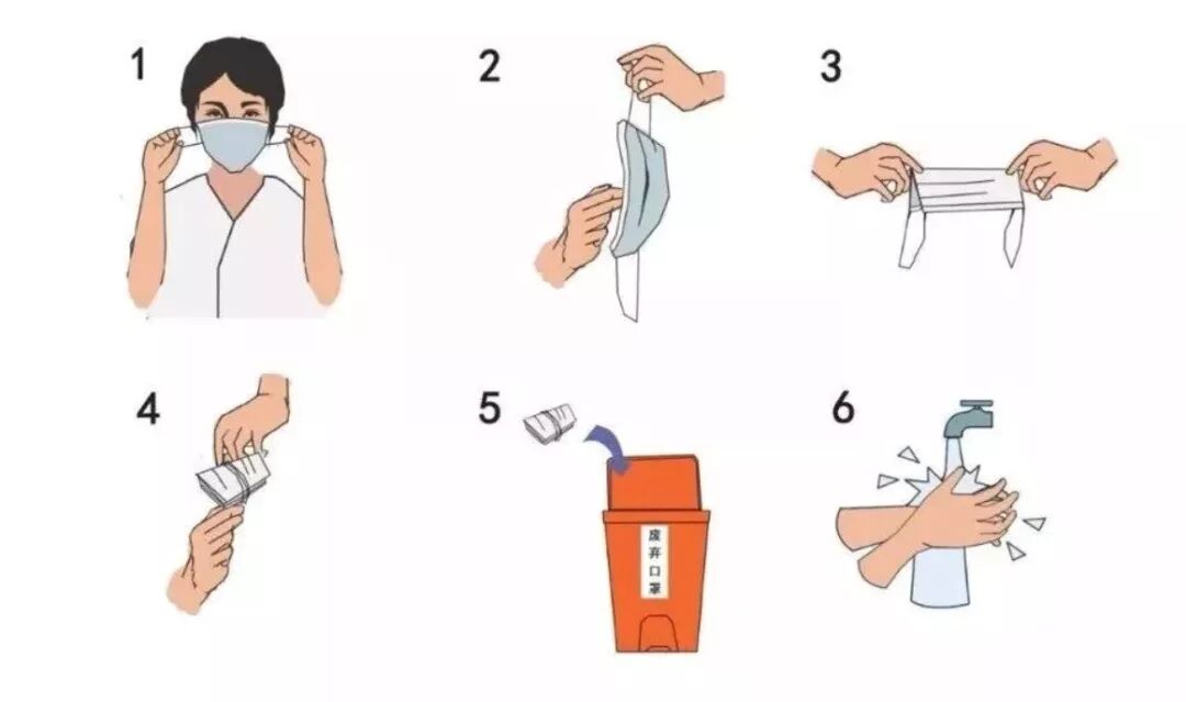使用过的口罩风险较低,按以下步骤取下后丢弃即可↓
