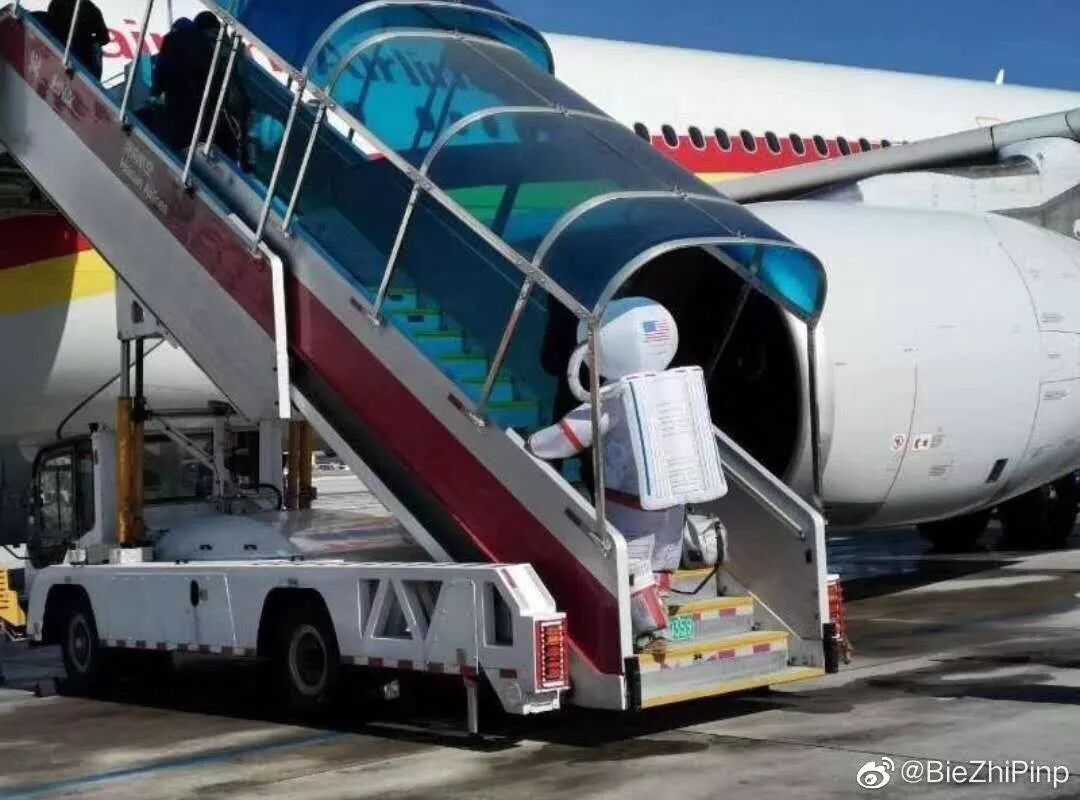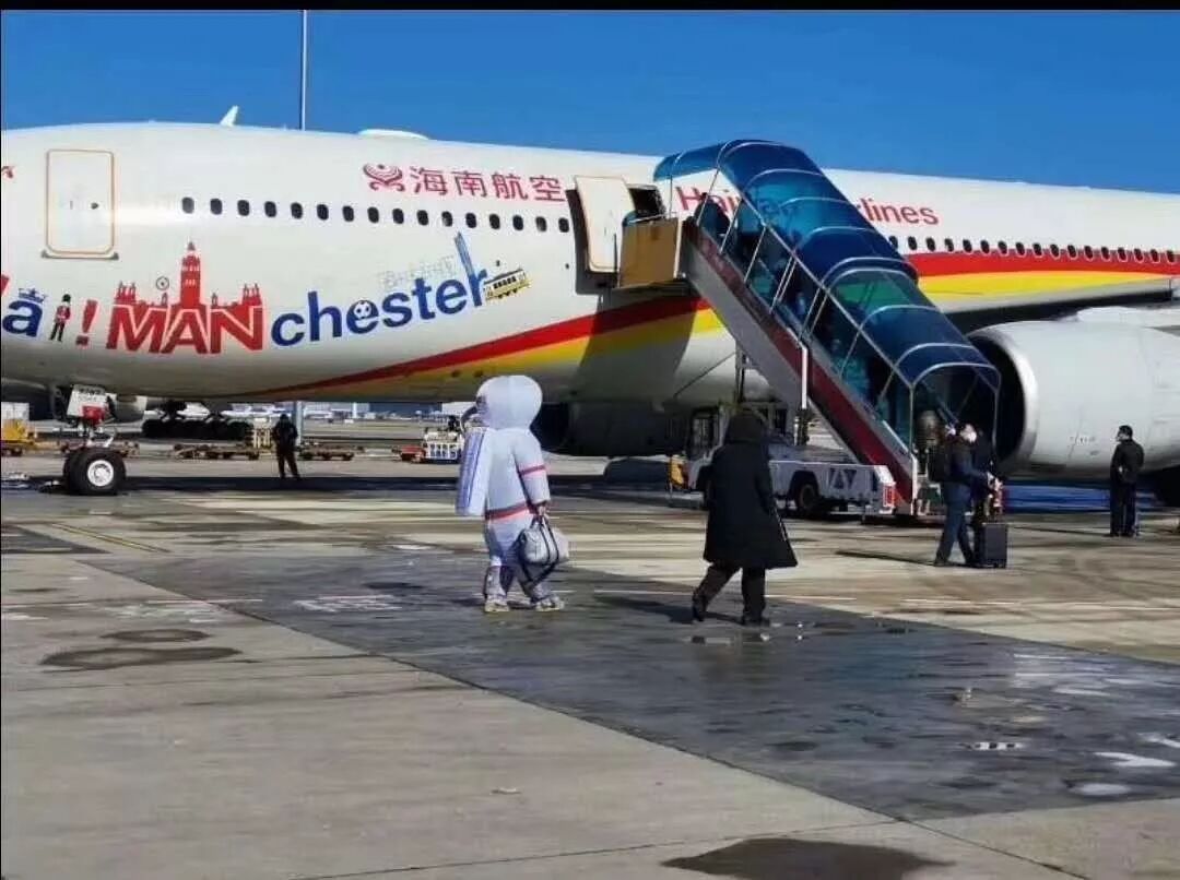 上面的图片不是宇航员登航天飞机,是一位网友穿上备有氧气瓶的自制防护服登上航班。很显然,这种自制装备太强大了,比医生的防护装备都强大,只是不知道他穿着累不累、热不热,吃点喝点什么的恐怕工程蛮大的。