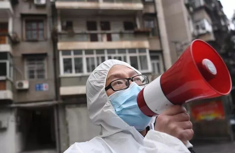 2月7日,武汉市蔡甸区街道干部用喇叭告知居民参加排查(图源:新华社)