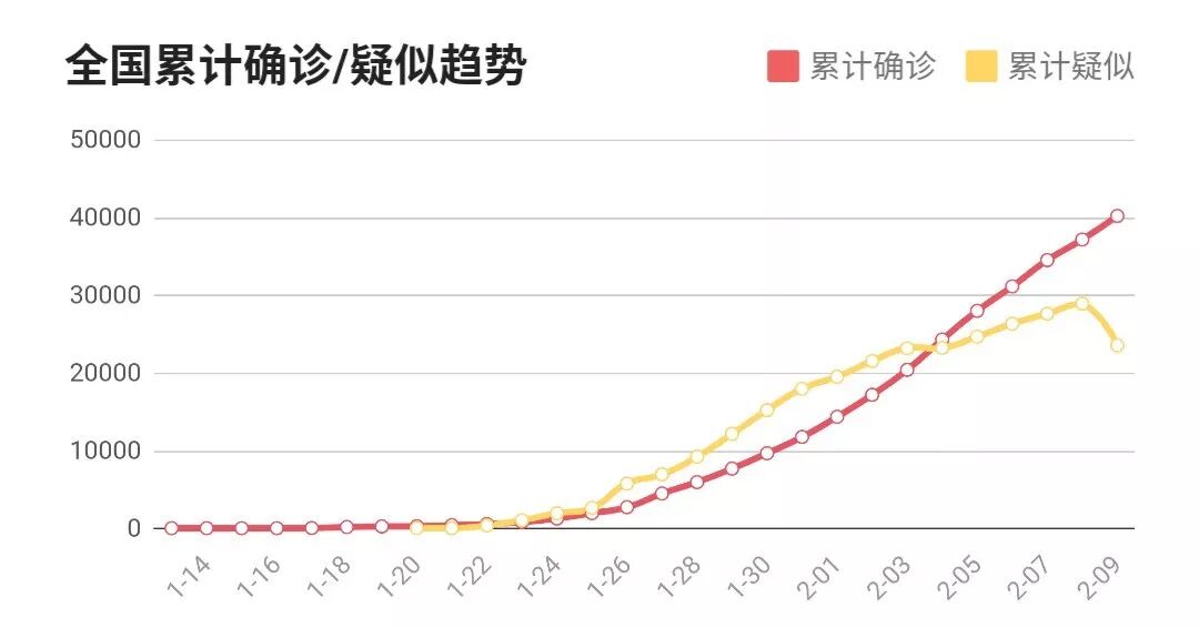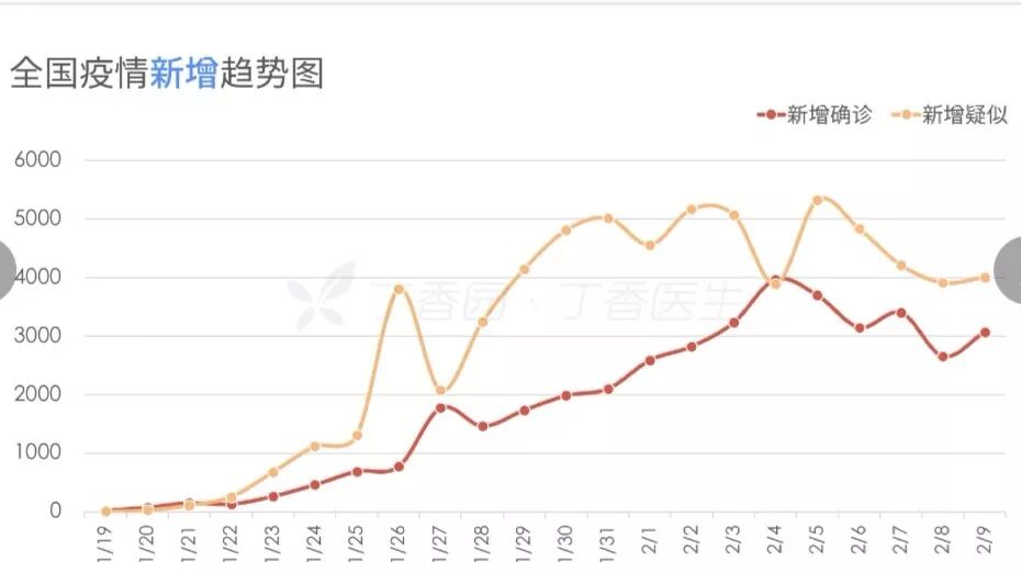 现在情况不错,2月9日全国新增疑似和新增确诊增加幅度都不大,请看下面的数据趋势图。