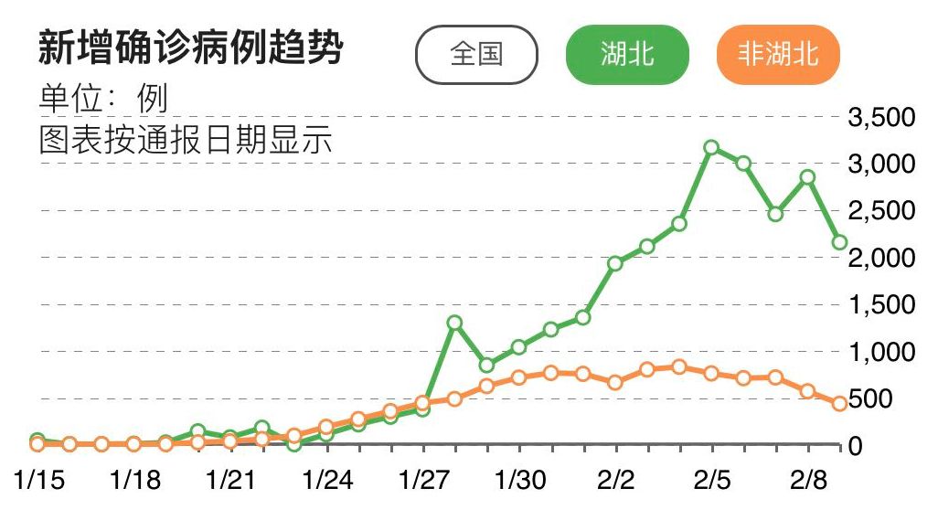 据湖北卫健委数据统计,2月8日0时-24时,湖北省新增确诊病例2147例,比2月7日减少近700例,是过去6天内最低。过去5日,这一数据分别为:2345(3日)、3156(4日)、2987(5日)、2447(6日)、2841(7日)。
