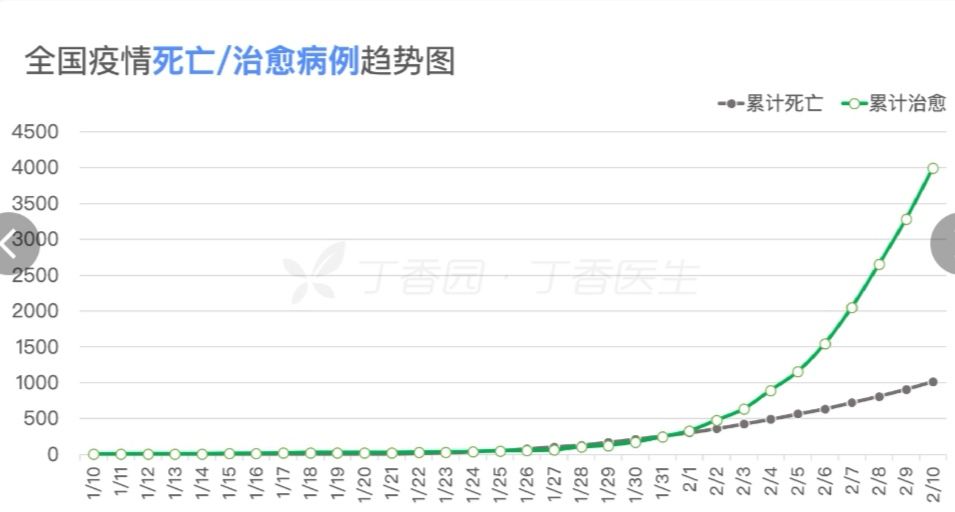 再看下图累计死亡和累计治愈的数据,累计治愈随着康复人数越来越多,增速会越来越快,这也是向好的一个迹象。