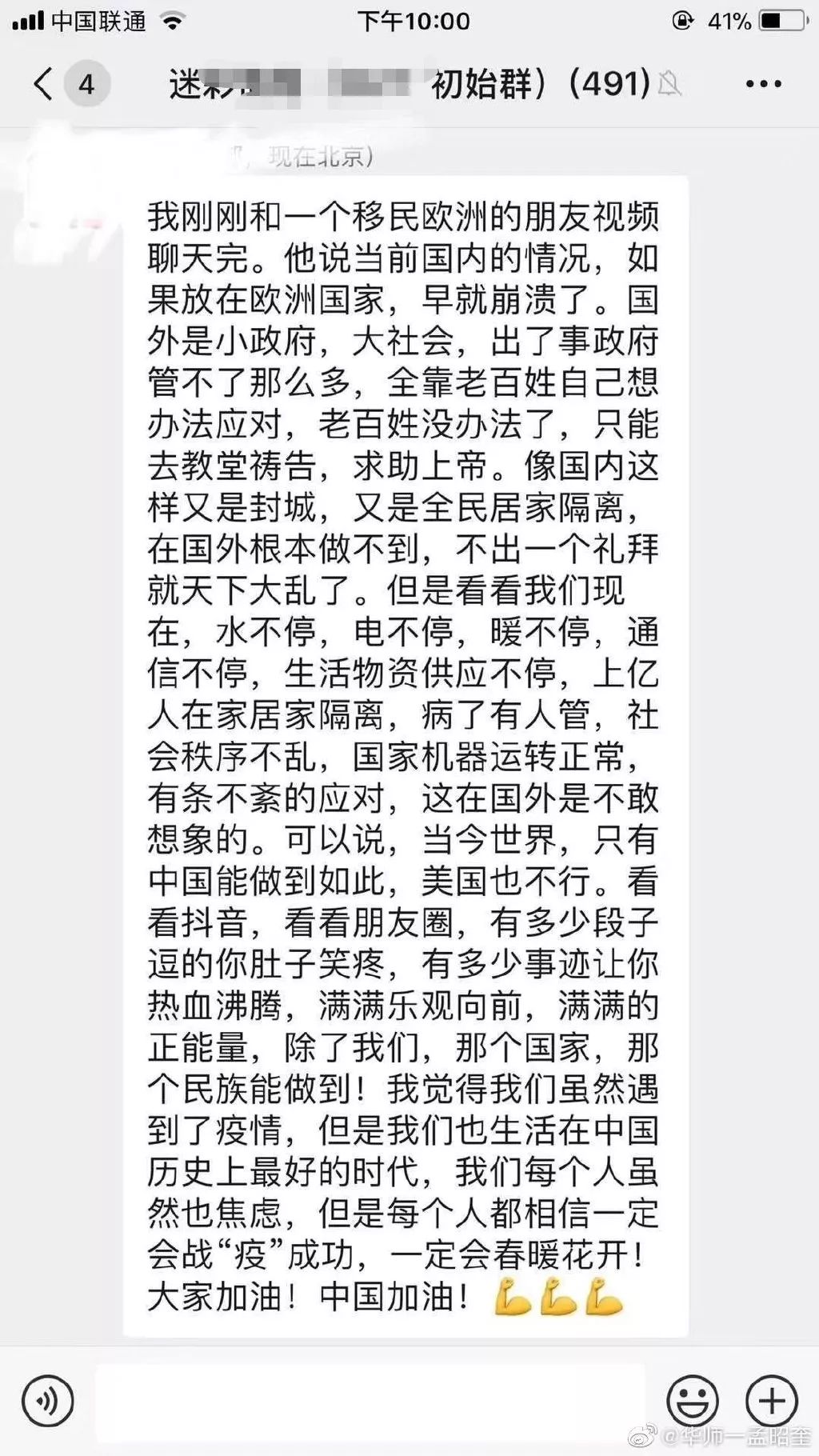 下面这些文字是一位网友在和移民到欧洲的朋友视频聊天后发的感慨,他说当前国内的情况,如果放在欧洲国家早就崩溃了,可我们大部分人在家窝着抗疫,十天半个月都不出门,但这么久不出门的情况下,大家的水电暖不是可以照样供应吗?生活物资不也是没受多大影响吗?大家不还是可以在家刷刷微博看看微信吗?哪怕武汉和湖北地区临时有些困难,经过一二十天的努力这不也扭转过来了吗?这一切,就是党和国家带领我们发展的成果,我们的体制机制决定了我们必然越来越好。