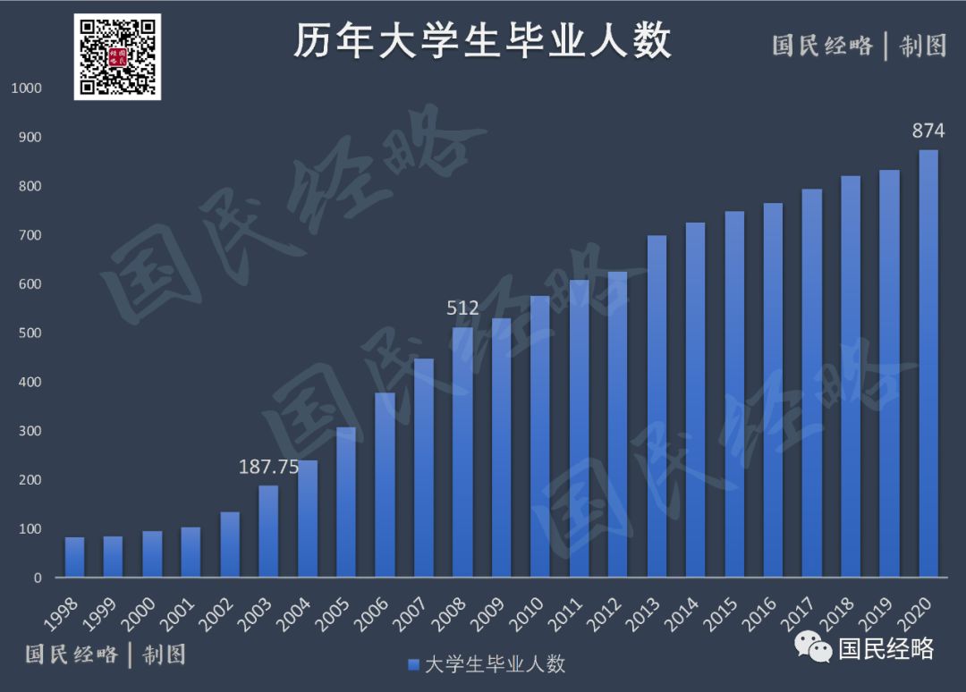 其一,2020年我国大学应届毕业生高达874万,相比去年增加40万。而非典所在的2003年还不到200万,全球金融危机爆发的2008年还只有500万。