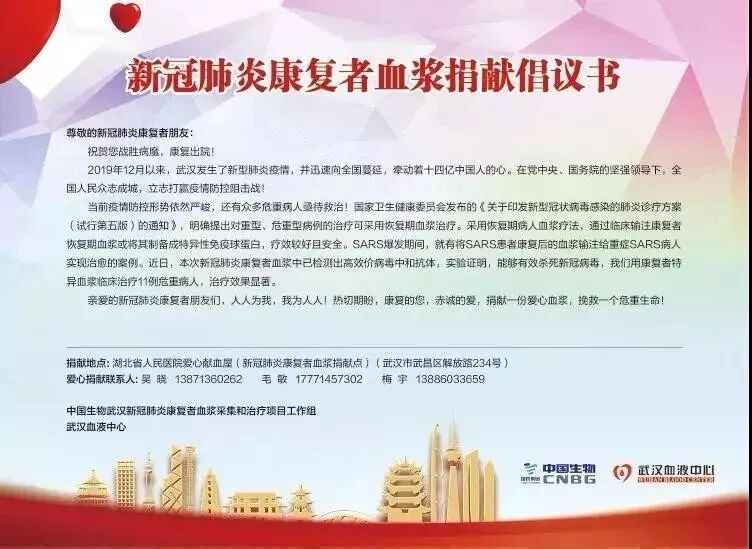中国生物发布血浆捐献倡议书,内附捐献地点及联系人