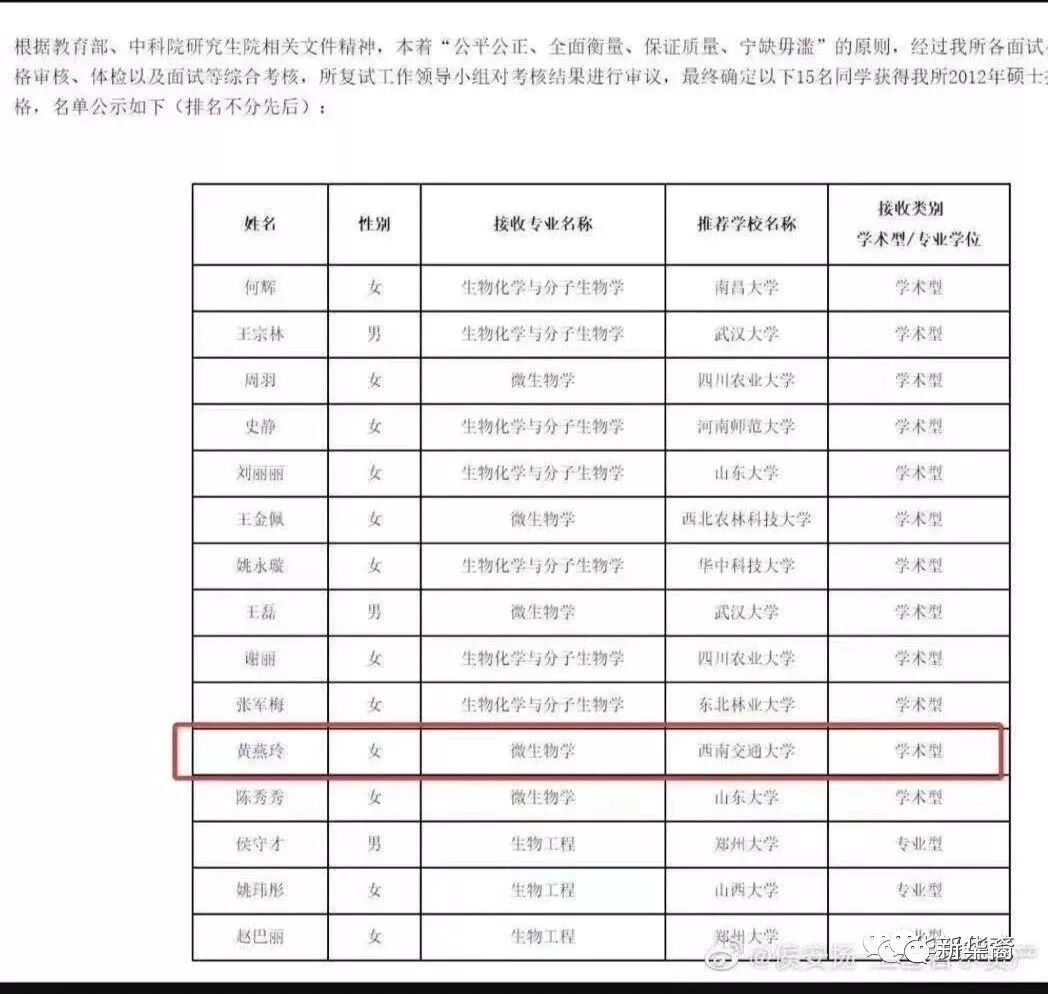 另据中科院武汉病毒所发布于2011年1月4日的《2012年度推荐免试硕士研究生拟录取名单公示》显示:黄燕玲系西南交大推荐的学术性硕士。