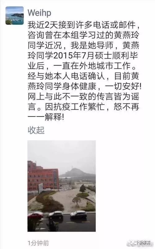 日前,网传黄燕玲的导师出来辟谣了,说黄燕玲一直在外地工作,本人现在身体健康,没有被感染。