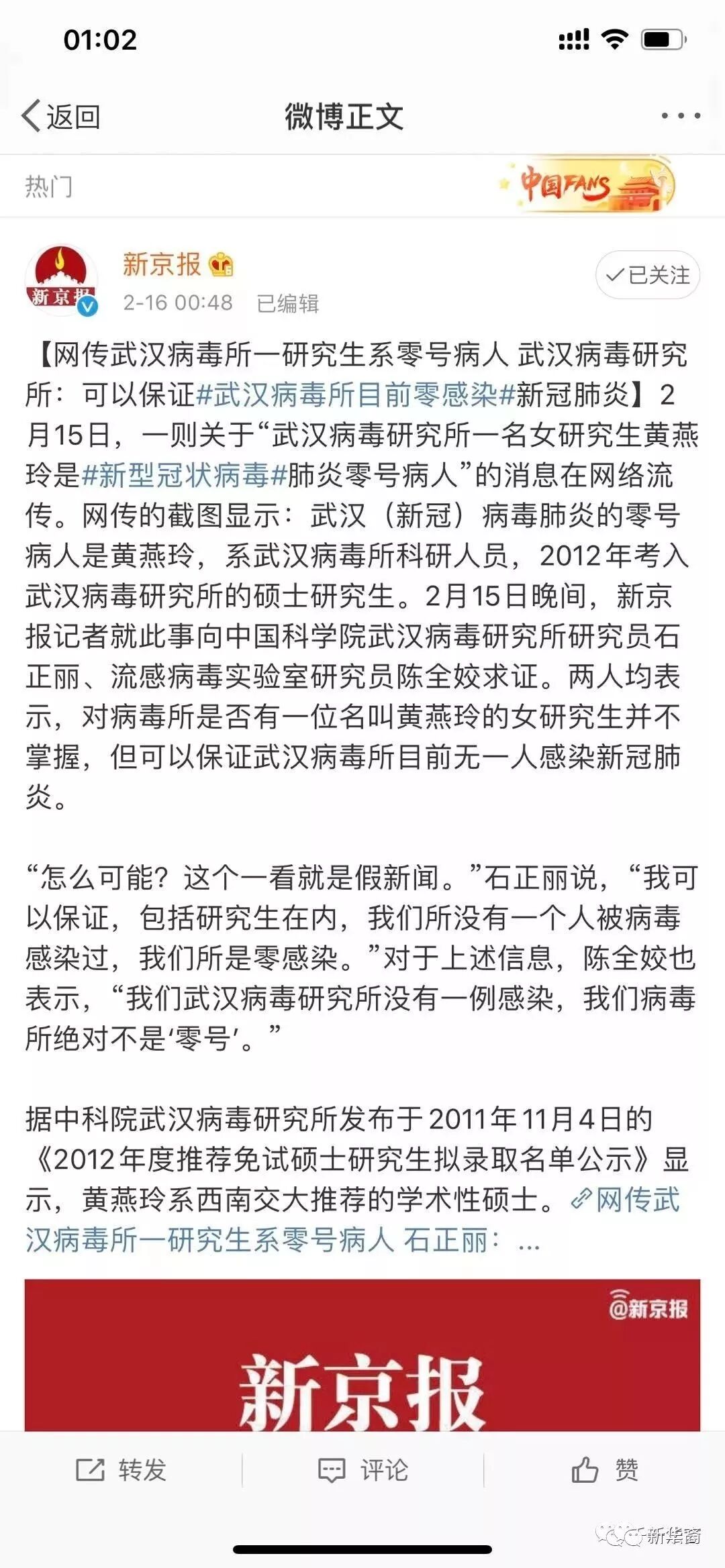 2月15日晚间,《新京报》记者就此事向武汉病毒所研究员石正丽、流感病毒实验室研究员陈全娇求证,两人均表示对于病毒所是否有一位名叫黄燕玲的女研究生并不掌握,但可以保证武汉病毒所目前无一人感染新冠病毒。