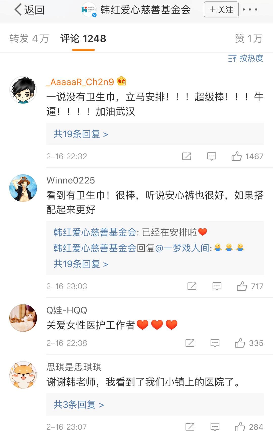 说,这皮带有点不朴素啊,不像是医学世家啊,之类的。有些键盘侠在疯狂开黑,但是韩红并没有停下慈善的脚步。2月14日,在司马3忌举报她的第二天,有网友拍到韩红慈善基金会捐赠的60辆救护车就整整齐齐地开进了湖北,准备进入雷神山医院。这两天,有不少女性一线工作者在微博求助,表示她们急需女性用品。2月16日,在韩红基金会就公布的在途物资中,就出现了5000包女性用品的身影。