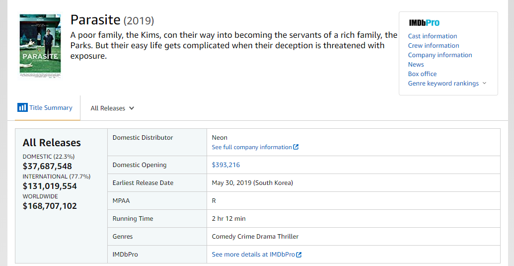历史的进程和无数个人的努力,最终把《寄生虫》送上了奥斯卡,拿回了四座金人,金人身后还有盆满钵满的票房。经过无数人策划奔波许久之后,期待的奥斯卡效应也如期而至。我大概统计了拿下大奖之后《寄生虫》全球票房的变化,趋势只有一个:全线飘红9号拿奖,10号票房就增加了15%+,一周翻了一倍,同样这也是《寄生虫》北美上映之后的最好票房成绩。即便是在票房不景气的周一,《寄生虫》也同样逆势上扬,发行量翻了一倍,同时,发售的蓝光版本也登上iTunes和亚马逊的销售排行榜榜首。不止美国,在日本,英国,西班牙、土耳其、印尼这些国家同样掀起票房狂潮,甚至部分国家还迎来史上观影人数之最。