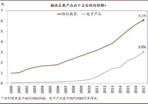 最根本的原因是,世贸组织原先对发展中国家多有照顾,根据WTO补贴和补偿措施协议规定,如果某个国家对产品生产的补贴超过其价值的1%,其它成员国可以倡议开展调查,并征收回应性补偿关税。对发展中国家来说,许可补贴数值为产品价值的2%。2018年,美国贸易代表办公室USTR公告,修改对发展中国家的反补贴调查方法很有必要,此前的相关指引可以追溯至1998年,已经过时。在印度、土耳其这些国家身上小试牛刀,2019年5月16日晚,美国政府宣布,因为土耳其经济发展水平“不再符合发展中国家身份”,取消给土耳其的贸易最惠国待遇,土耳其对美国部分出口商品不再享受免税优惠,次日生效。这一部分占土耳其当年对美出口总额的18%左右,当晚,土耳其里拉对美元汇率贬值0.3%,来到6.06:1。土耳其早在1975年就以发展中国家身份加入关税与贸易总协定(GATT,WTO前身)的“普及特惠税制度”(GSP),对发达国家的部分出口关税豁免。现在,待遇说没就没了。美国取消发展中国家身份、取消贸易最惠国待遇,有哪些标准呢?标准认定不一样,包括人均国民生产总值、贫困率、出口多元程度等,这次范围更大,有被世界银行认为是“高收入”国家的所有国家、经合组织(OECD)成员国和准成员国、G20成员国,以及外贸额占世界外贸总额0.5%以上的所有国家。印度就是这样子被取消发展中国家身份的,谁让你是G20、是大国呢。至于越南,经济和贸易增长强劲啊。2018年,越南全年进出口总额创下4822亿美元的新纪录,贸易顺差72亿美元,是有史以来贸易顺差最大的一年,是2017年21亿美元的顺差3倍有余。下面这张图是UN Comtrade和中金公司研究部给出的越南纺织服装和电子产品出口在全球出口的市场份额图。