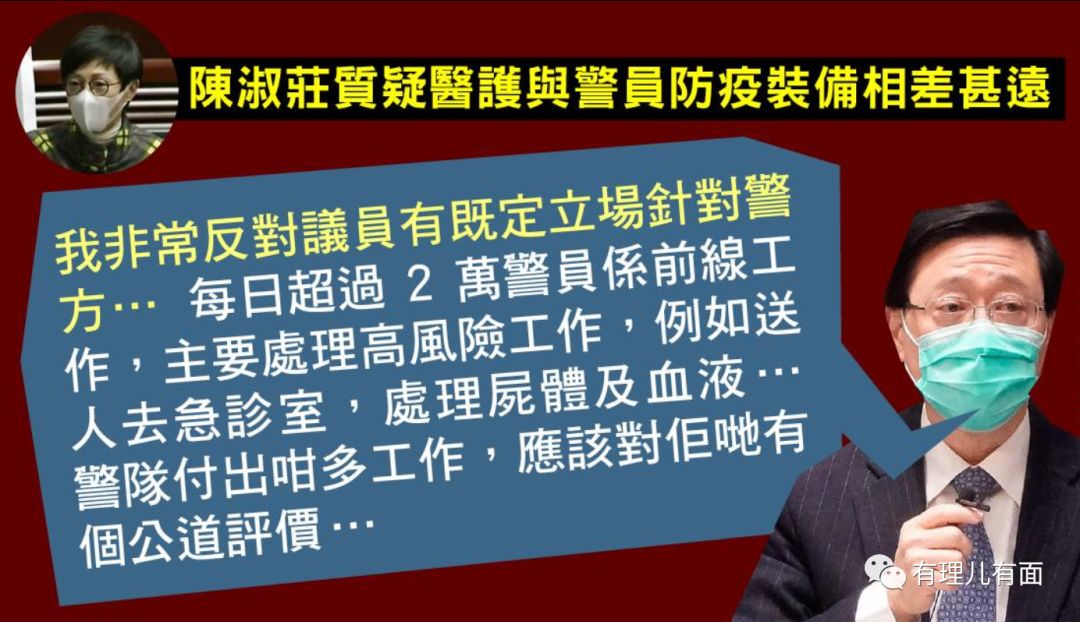 保安局局长李家超回击道,警方是人数最多的政府部门,每日有两万名前线人员,并且在防疫中担任不同角色,例如送犯人到医院、驻守医院及隔离营、处理尸体和血液等。警方现时的口罩存量只够一星期,每次用完都要向政府申请。如果警察做这么多工作却不给予应有装备,是不公道的。李家超表示,警队面对突发情况时就会有不同风险,“如果有人想离开隔离营时,要近距离亲身接触,又有谁呢?就是警队。”他非常反对有议员以既定立场针对警方,而这个既定立场已不是今天的事。警队付出这么多,应该要对警队有公道评价。攻击警队被呛,反对派乱港议员又置口罩供应链紧张的事实不顾,大放厥词,胡说什么政党、商户、艺人成功搜购口罩,唯独政府买不到,企图以口罩供应短缺来刻意抹黑特区政府抗疫工作。政务司司长张建宗马上反驳这些毫无常识的议员:政党、商户、艺人搜购到口罩数量,甚至不能满足公立医院一天的消耗量,特区政府正常三个月的库存需要近6000万个口罩,目前仅剩下够一个月使用的1800万个口罩,正在积极采购。其实,当前口罩供应紧缺,是全球性的。因为全球最大的口罩生产商在中国内地,主要原材料超过九成也由内地生产,春节长假导致库存大减,与疫情爆发双重叠加,再加上疫情在各国出现,口罩需求激增。黄之锋之前倒卖的美国口罩,不也是“中国制造”吗?春节过后,中国内地所有口罩生产线全面开工,同时,一些适合转型生产口罩的工厂,亦进行生产,但还未满足当前全球的需求。对于反对派的抹黑,香港媒体评论道:乱港政客仅凭两片薄唇,能生产出足够全港所需的口罩吗?凭口水买到口罩吗?疫情当前,喷口水花,根本无助抗疫。乱港政客若然真的有能耐,不妨开记者会宣布能够买到香港所需的口罩,想必政府都会出钱收购。