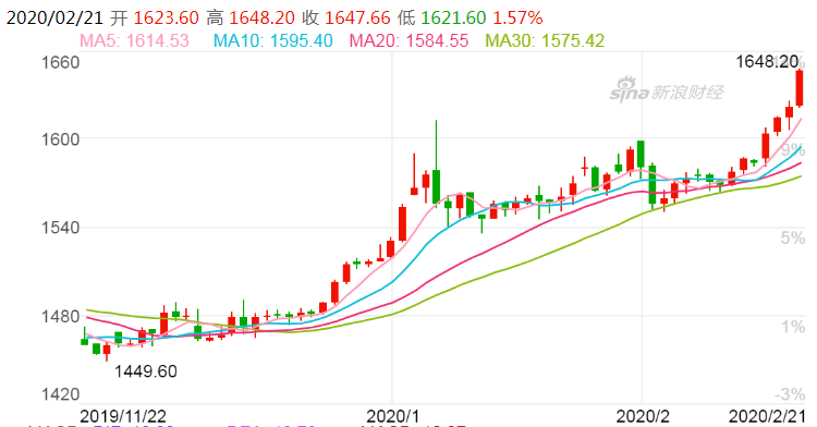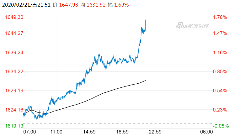 所以,2020年的“抗疫战争”仍然非常艰巨,从国内国外形势看都不容乐观。尤其是现在距离气候全面变暖还比较远,或许最终能遏制疫情的,还是要靠自然的轮转(春去夏来),就像2003年的非典一样。疫情的最新判断,也影响到了国际金价,2月21日晚上黄金价格继续上涨: