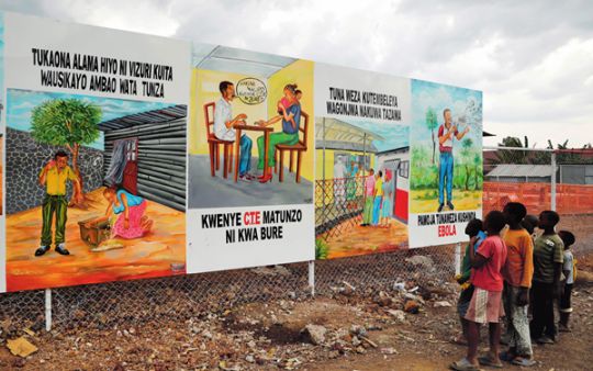 2019年8月3日,刚果(金)戈马,孩子们在看传播预防埃博拉感染知识的宣传画