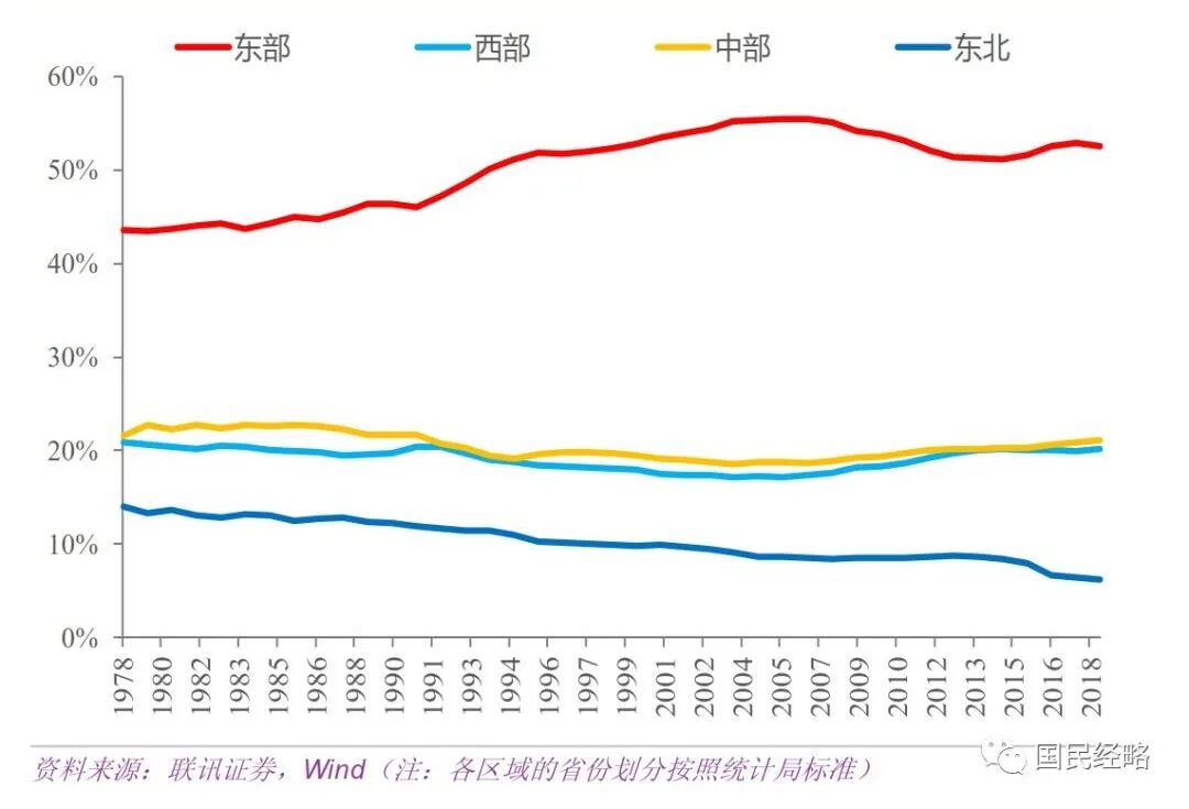 同时,随着人口红利消退,我国开始面临产业转型升级。以广东为代表的东南沿海省份,率先向高新产业进军,而坐拥劳动力优势的中西部人口大省,则承接了从沿海转型来的劳动密集型产业,因而工业增速不断飙升,经济由此水涨船高。北方经济面临的一大问题是,除了北京之外,多数北方省份的支柱产业都过重过于传统。在北方,重工业、传统工业和资源型产业的比重显著高于南方,而在互联网、生物医药、电子科技等高新产业领域落人一步,无法应对后人口红利时代的竞争格局。此外,国家战略的转移、市场化程度的高低、民营经济的活跃程度、营商环境的优劣,在其中也起到举足轻重的作用。“一带一路”、京津冀协同发展、长江经济带发展、长江三角洲区域一体化发展、粤港澳大湾区建设、黄河流域生态保护和高质量发展、推进海南全面深化改革开放。