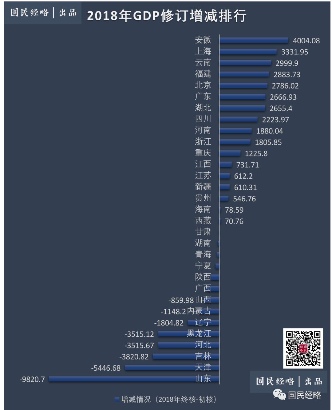 反观北方地区,尤其是东北地区,无论经济增速还是经济比重,均面临下行趋势。这一轮经济普查更是加剧了这一局面,南方普遍增水,北方地区普遍面临挤水分,南北差距再扩大。可以说,中国区域经济差距,正在从“东西差距”变成“南北差距”,这将影响未来十年全国的省域经济格局。这次普查,对2018年的GDP进行了修正。全国GDP增加了18972亿元,增幅为2.1%,达到了91.9万亿。虽然经济蛋糕扩大了1.9万亿,但不是每个地方都有缘享受。相反,部分省份甚至面临新一轮挤水分。不难看出,除北京、河南、新疆外,GDP上调的基本都属南方地区。而除广西、湖南外,下调的基本都是北方省份。安徽(+4004亿)、上海(+3331亿)、云南(+2999亿)、福建(+2883亿)、北京(+2786亿)、广东(+2666亿)。