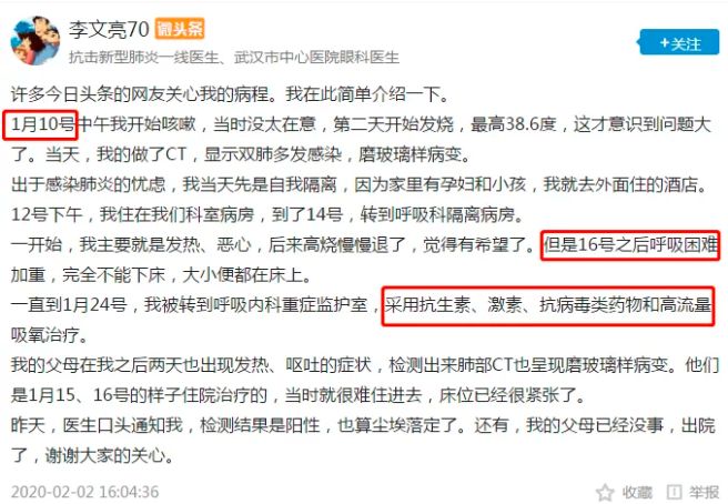 2月7日凌晨2点58分,李文亮医生去世。他曾在微博中分享过他接受的治疗,一直采用抗生素、激素、抗病毒类药物和高流量吸氧治疗,我们没有看到中药介入。这不禁让我们想:假如李文亮医生用上中药,或许是另一个结果!但,没有假如,历史不可能重来。