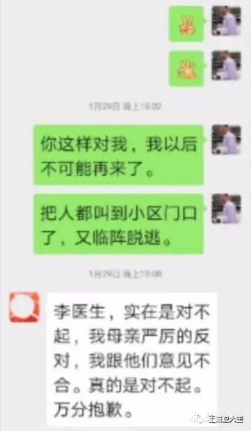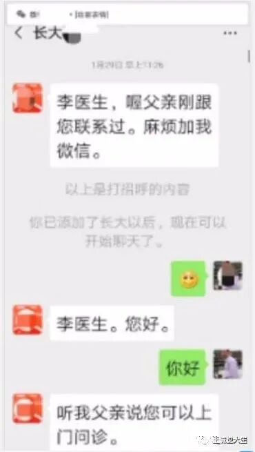 从上面的聊天纪录,我们可以看出,起先是陈北洋先联系到了李跃华医生,然后具体由他儿子小陈负责与李医生沟通联络。第一次李医生上门问诊,因为陈北洋夫人的坚决反对,而放了李医生的鸽子,把李医生叫到了小区门口又把他打发走了!