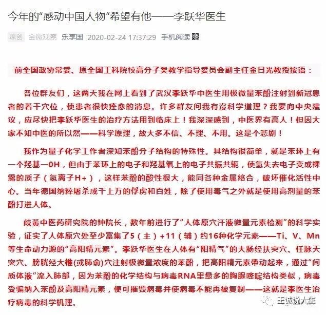 其实新冠病毒并没有那么可怕,在湖北以外的省份,它的致死率只有0.7%,只比流感高一点。如果一开始就用李医生的治疗方法,打一针就好了,那么民众就不会产和恐慌,也不会有那么大的舆论压力,更不会让管佚之流的谣言变成遥遥领先的预言。