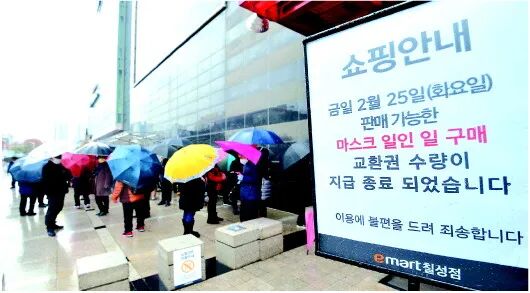 韩国大邱,居民在雨中排队购买口罩,超市告示每人当日限购一只口罩。来源:新华社