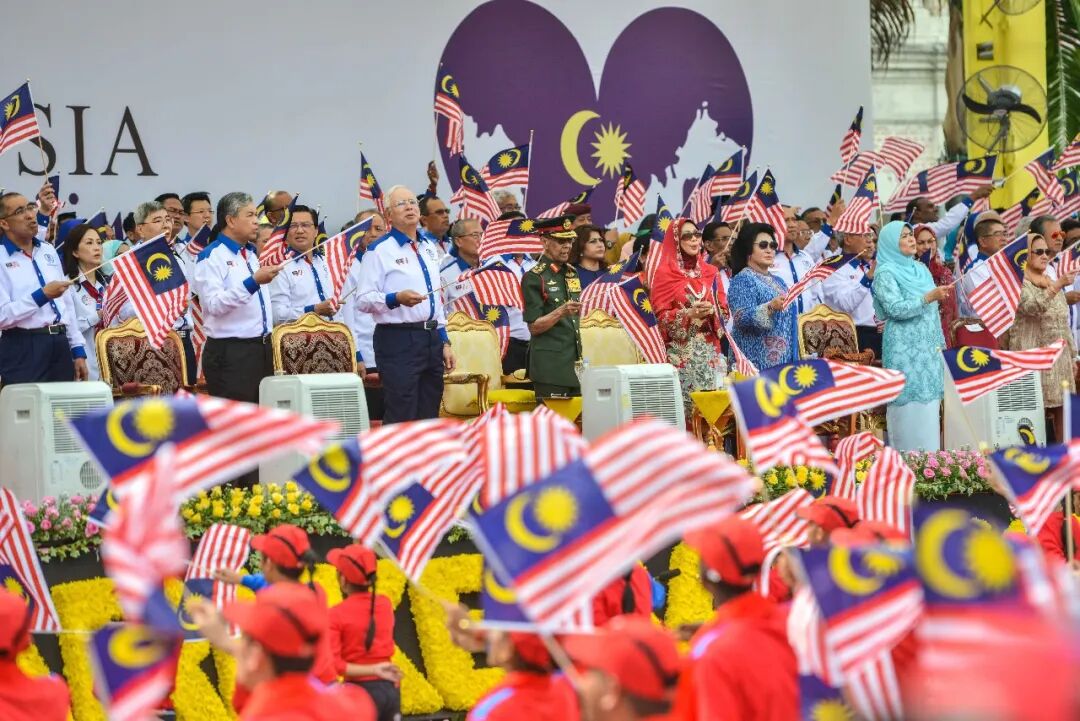纳吉布(前排左三)出席马来西亚独立59周年庆祝活动(2016年资料图)