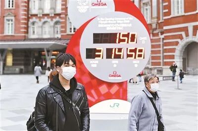 2月25日,戴着口罩的行人经过东京奥运会倒计时电子屏。 图源:新华社