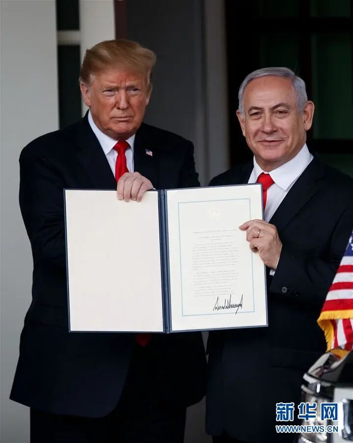 2019年3月25日,在美国首都华盛顿白宫,美国总统特朗普与以色列总理内塔尼亚胡展示特朗普签署的正式承认以色列对戈兰高地的主权的公告。
