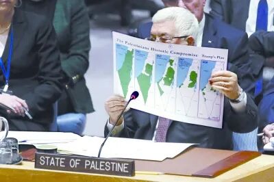 2月11日,在位于纽约的联合国总部,巴勒斯坦总统阿巴斯在安理会中东局势和巴勒斯坦问题公开会上手持地图发言。 新华社记者 李木子摄