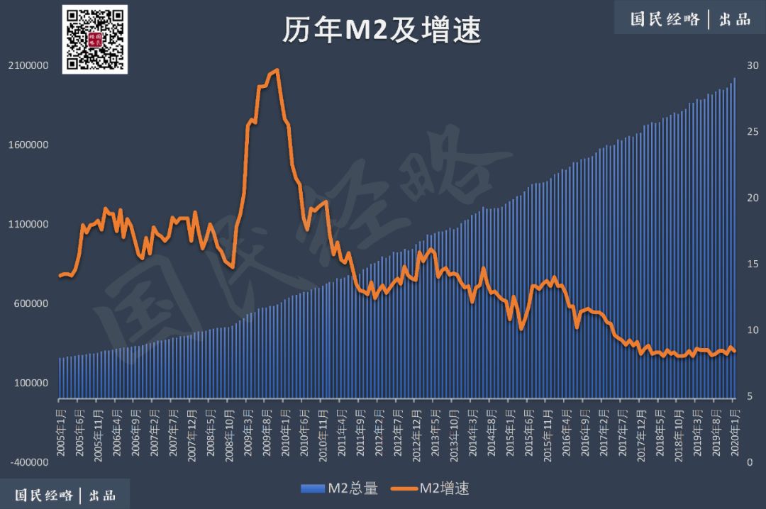 据每日经济新闻报道,截至目前,已有河南、云南、福建、四川、重庆、陕西、河北等15省份推出重点项目投资计划,2020年度投资规模超6万亿元,其中同步公布总投资规模的9个省份,总额超过24万亿元。仅9个省份,总投资规模就超过24万亿,全国总投资规模可能超出想象。在意外冲击面前,基建发力,无疑将会有效稳定经济。众所周知,投资、消费、出口可谓经济的“三驾马车”。消费对应的是内需,出口对应的外需,当疫情扩散到全球,无论内需还是外需均受到影响,投资就成为稳经济的重中之重。这让人想起2008年的“4万亿大投资”,还让人想起随后的房价上涨和物价新高,这一次有何不同?其一,当时的“4万亿大投资”,伴随着货币的空前宽松,刺激是全方位的,而这一次货币政策仍旧相对谨慎。十多年前,广义货币总量M2增速达到了两位数,2009年年中更是创下了29%的记录。两位数的货币增速,自然会对包括房价、物价在内的所有行业带来明显影响。