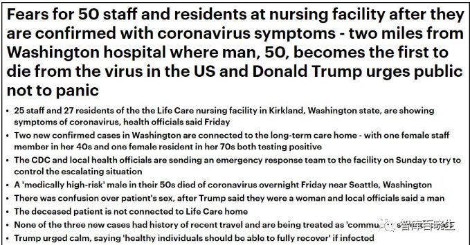 2月28日,美国卫生官员承认华盛顿·基尔克兰生命护理中心的25名护士和27位居民出现了冠状病毒症状。