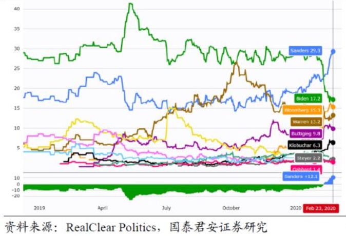 如果桑德斯成功赢得党内初选,那么美国股市甚至全球风险资产都将面临冲击。这个逻辑不用过多解释,细品一下,大家都懂。
