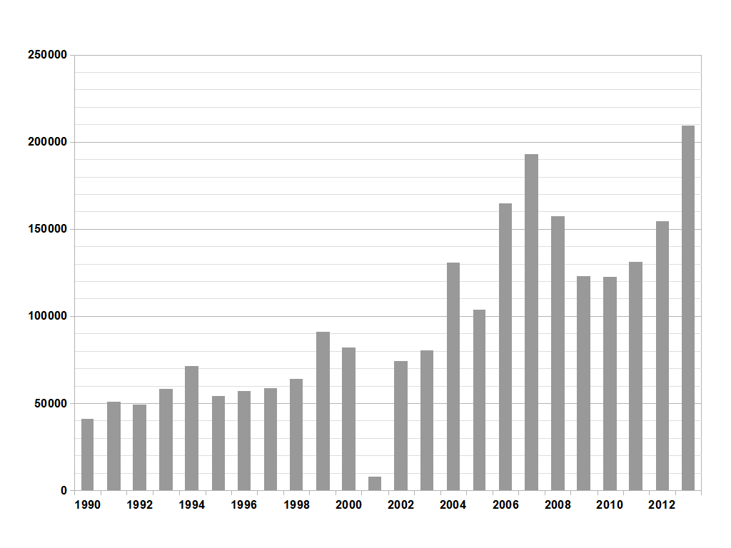 阿富汗罂粟种植面积, 1990–2013 (单位:公顷)