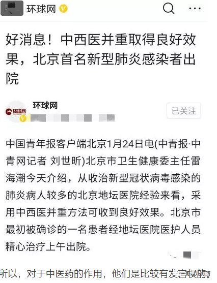 随后,2月6日,国家中医药局官网发布,中药清肺排毒汤治疗新冠肺炎总有效率可达90%以上。2月10日,湖北省中医院党委书记巴元明教授接受采访时说,“中医药参与的总有效率达到了90%左右。”甚至就连中纪委网站和中军网也在为中医助力。
