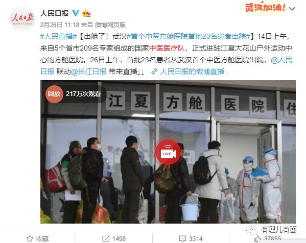 2月6日,武汉又传来一个令人振奋的消息:湖北省中西医结合医院18名已治愈的患者集体出院。其中年龄最大的67岁、最小的23岁,住院天数最长18天,最短6天。同日,武汉市中医院也有5名患者出院。张伯礼院士表示,出院的患者是在中西医结合治疗方案下痊愈的。所用的中医方案就是目前新冠肺炎诊疗方案中的中医方子,只是根据各人的情况用药酌情增减。对轻型病人来说,中医治疗可以阻止新冠肺炎向重型发展,促进痊愈;对重型患者来说,中医治疗可以控制渗出,稳定血氧饱和度。