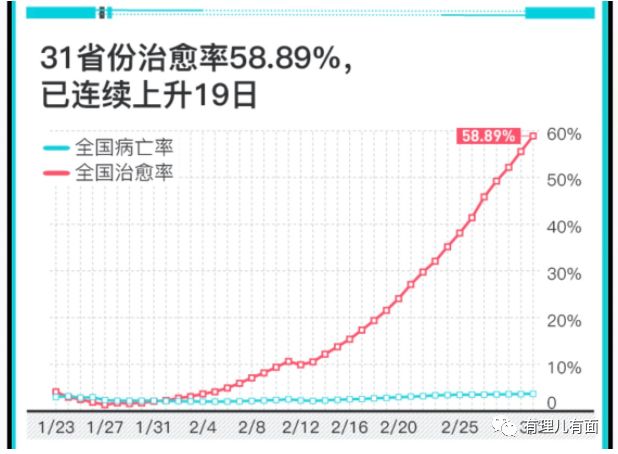 随着中医药及时、深入地介入,各个省份的治愈率也节节攀升。以湖北为例截至3月2日24时,湖北省共指定定点救治医院238家,当日新增出院2410例,累计治愈出院36167人,治愈率从2月12日的7.14%持续提升至3月2日的53.81%。而31省份新冠肺炎治愈率58.89%,已连升19日。