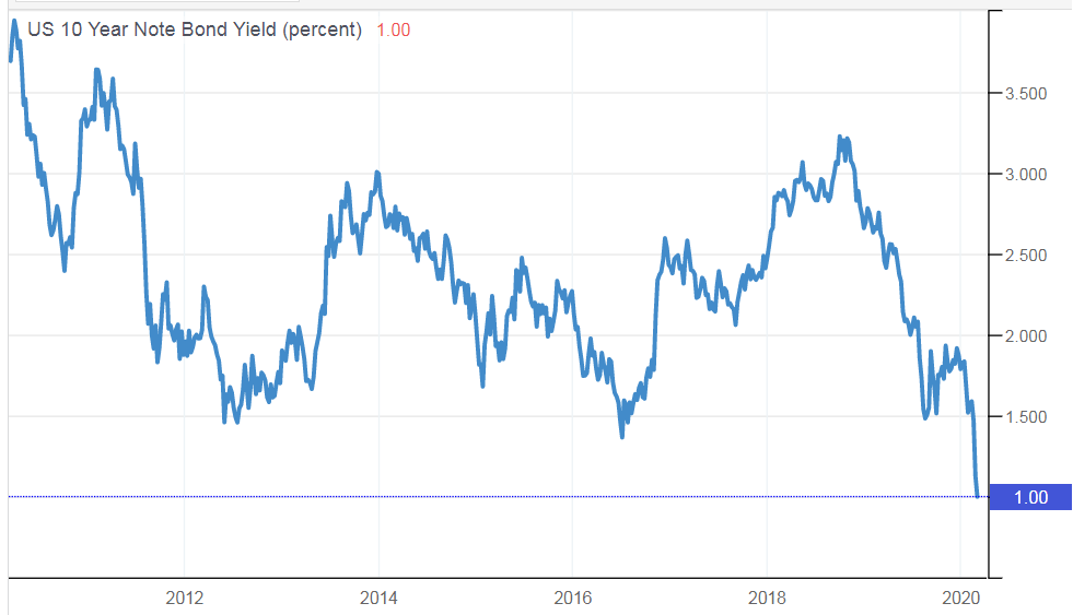 美联储降息终于兑现,这将怎样影响全球,又怎样影响中国?作为全球三大泡沫之一的美股,是否已经破裂?第一,美联储降息意味着全球新一轮货币宽松开始了!会有更多央行降息、扩表。3月3日中午,澳大利亚央行已经提前降息(25个基点),把基准利率降低到了历史最低水平。随后,马来西亚央行宣布跟进降息,降低25个基点至2.5%。美元是全球最重要的货币,美联储大力度、非常规降息,印证了全球经济遭遇重大压力,也将带动全球主要货币降息。在美联储降息之后,已经有沙特、阿联酋和中国香港宣布降息,幅度也都是50个基点,俨然“夫子步亦步、夫子趋亦趋”的样子。美联储主席鲍威尔在降息后的发布会上说:“一次降息不足以解决供应链问题,但可以避免金融环境收紧”。目前市场普遍预期,美联储会在4月继续降息。而特朗普就更加直言不讳,他在推特上说:“美联储必须更宽松,而且最重要的是,要赶上其他国家和竞争者。我们在一个不公平的竞争环境中,对美国不公平。”“终于到了美联储带头的时候了,让宽松和降息来得更猛烈些。”这是赤裸裸地煽动货币战争。很多精英经济学家对“货币战争”这种阴谋论嗤之以鼻,但世界就是由特朗普的粉丝和特朗普这样的政客执掌、构成的,当他们相信有货币战争的时候,就必然有货币战争。你不相信,只能证明自己幼稚。这就是民粹主义时代的奇观。我之前多次在专栏里预测:新一轮货币宽松即将开始,竞争性的贬值即将开始。现在,该来的都来了,还会继续来。第二,美联储降息,给中国央行进一步宽松留出了空间,3月20日的LPR利率有望继续走低。目前限制中国降息的是两大因素,一个是中国CPI仍然在高位,回落需要时间;另一个是美元的制约。由于中美达成了贸易协议,人民币汇率需要保持稳定。如果人民币单方面降息,则会显著贬值,带来一些争议。现在美联储大力度降息,一次达到50个基点,给每次降息只有10个基点的中国央行提供了非常大的降息空间。第三,美国“超级大牛市”面临终结的可能性,这要看疫情会不会在美国全面传播。目前美国确诊病例突破100,死亡病例也开始全面上升。欧洲的“沦陷”看来已经很难避免,美国也面临巨大的风险。如果疫情在欧美全面扩散,美股大牛市至少会暂停。而股市的多米诺骨牌倒下,可能引发不可测的风险。值得注意的是,今天凌晨美国10年期国债收益率首次跌破1%(下图),30年国债收益率也创下了1.601%的新低。