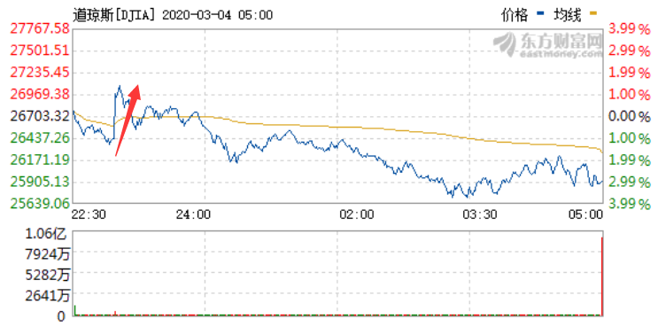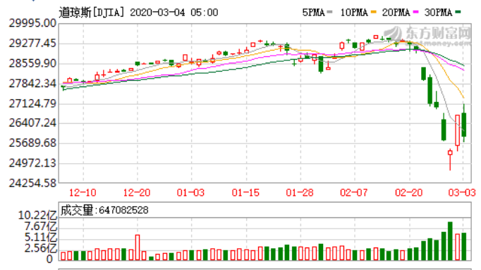 由于新冠肺炎疫情开始在全球扩散,在韩国、日本、意大利、伊朗等地都出现了失控迹象,而在美国也开始广泛传播,死亡人数开始增加,美国的华盛顿州和佛罗里达州都已经宣布进入紧急状态。美股乃至全球股市的惨跌,直接影响美国经济的预期,而2020年是美国的大选年,11月将举行总统选举。特朗普正在力争连任,所以对股市大跌、经济下滑无法容忍,不断对美联储喊话,要求美联储出手。由于情况特殊,美联储不敢怠慢,打破常规祭出了12年没有使用的“非常规会议降息”,而且一次下调了两种政策利率,力度为平时的两倍。美联储宣布降息之后,黄金出现了显著反弹,纽约黄金大涨了接近3%:道琼斯指数稍有反弹,但随即走软,最后反而跌了接近800点:
