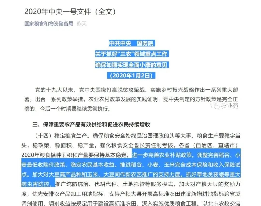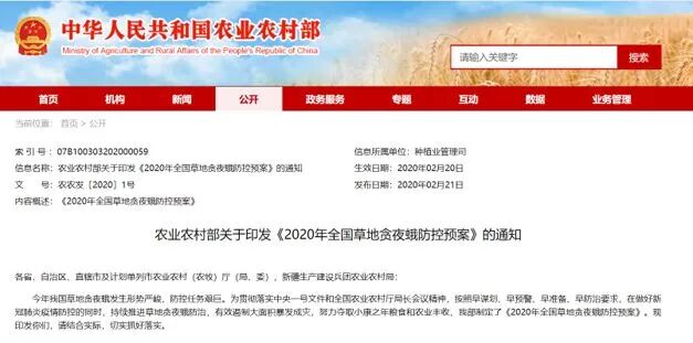 2020年2月20日,农业农村部第四次发布草地贪夜蛾防控应对预案。