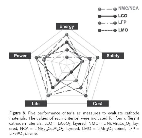 如下图所示,评价一款电池,一般可以从五个维度出发,即功率、能量、使用寿命、成本和安全性。