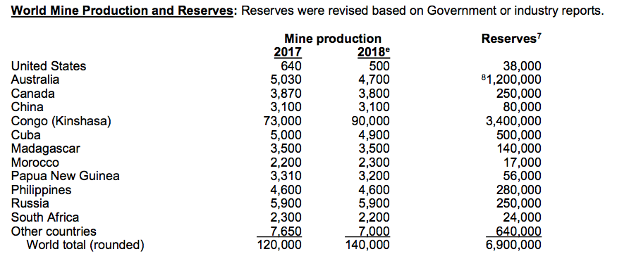 图为美国地质调查局“全球钴产量与储量统计”