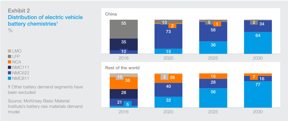 根据麦肯锡咨询公司统计数据,除中国外,全球其他国家和地区的车用动力电池装机量中,三元锂电池占比高达90%以上。
