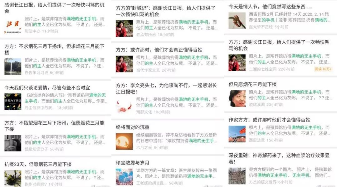 而且方方的粉丝众多,光是微博就有500多万,说真的,我要把丑话说在前面,我不怕水军漫灌,也不怕方方的反击,我怕的是中了方方蛊毒的友军的攻击。因为在我在朋友圈里面发现许多不明真相的粉丝都在转发方方的封城日记。