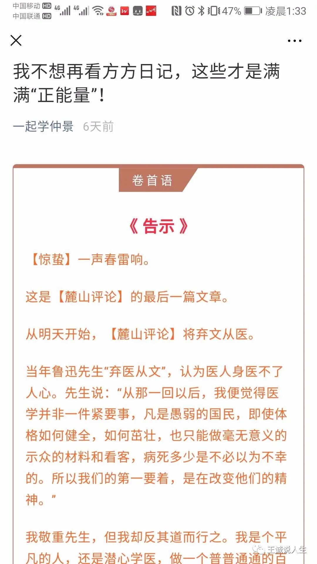 还有某个陕西著名作家安黎写了一篇《方方日记之我见》,让一个小号转载了,结果平时原创文章阅读量三五百的小号,这篇转载文章反而录得了数百万的阅读量,惊得作者第二天写了篇读后感文章来蹭流量,结果可能没写好,直接被删了。这个就是他们团队协作的玩法,要流量有流量,要削你就削你,无非是顺我者昌,逆我者亡那一套。