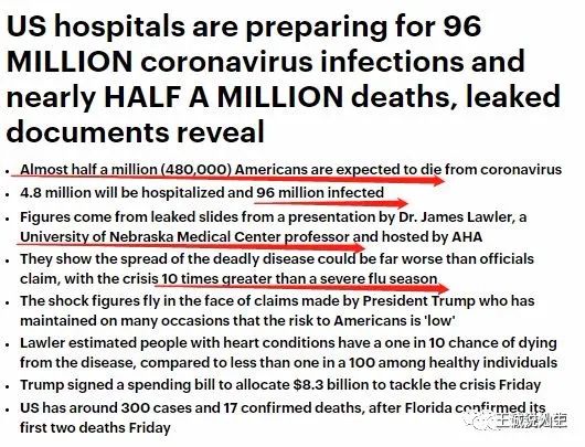 这个预测把感染率算得很高,把致死率算得很他低,要知道现在意大利的致死率已经超过了5%,真不知道老美哪里来的信心做到0.5%,也许老美真的有解药,哈哈哈,就是不给穷人吃,借此来消灭垃圾人口!去老龄化!