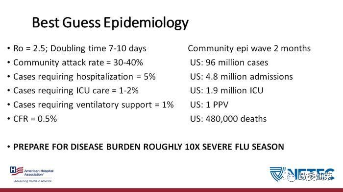 会议期间展示了一份幻灯片,题目为“卫生保健机构负责人需要知道的事实:为COVID-19做好准备”。演讲人来自“美国国家埃博拉培训及教育中心”,做为这个演讲的一部分,其间来自美国内布拉斯加州立大学医疗中心的James Lawler教授对新冠病毒会对美国造成多大影响进行了“最好情况下的预测”。具体内容如下: