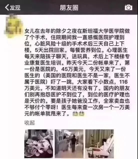 说中国看病难看病贵的,你们看看上面这个新闻就知道了,活在中国是多少幸福的事情。一位美国华人带女儿在斯坦福大学医院做了个小手术,住院了五天,结果光是两张账单是就高达161万美元,最终账单高达3000万元,比国内贵了一千倍不止。