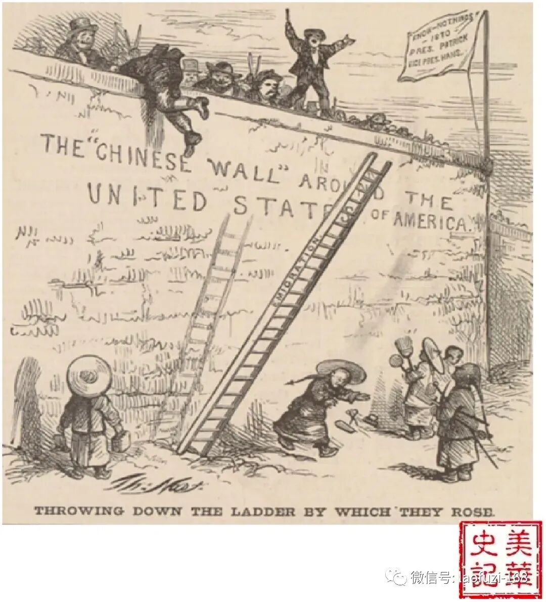 1870年纳斯特发表政治漫画:“先翻墙后拆梯”, 抨击加州白人移民公然排挤华人移民美国的恶劣行为。