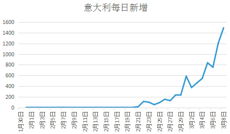 意大利犯的错误和韩国类似,被表面上的安全数据麻痹了,没有注意到内部已经传得非常可怕了。运气也差了点,到2月下旬才爆出来。意大利也努力检测追查,封城很坚决,一开始就将11个小城镇隔离了,到3月8日甚至不惜将1600万人的大地区封锁。