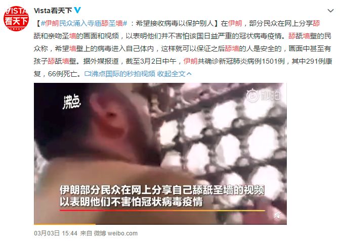 伊朗人的错误是,对疫情开始不重视,没有早发现早隔离。这是各国的通病,伊朗是运气实在太坏。但是疫情爆发了,伊朗人还是不够重视,用宗教式的大无畏面对病毒,甚至去赌气舔墙。