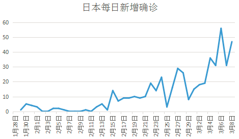 日本的疫情曲线比较奇怪。随着时间过去,每日新增从几例,升到十几例,再到四五十例,疫情是越来越大了。但是这个指数形态还没有出来,曲线很不光滑,受到了很多偶然和人为因素扭曲。每日几十例新增确诊,谈不上指数增长形态。而且日本的死亡人数也不高,至3月8日仍只有7人。以上数据都是除去钻石公主号邮轮的。